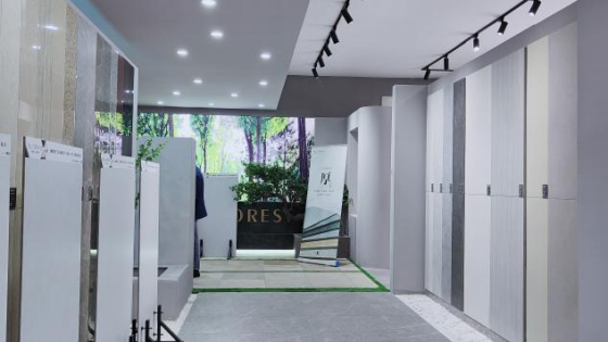 冠珠瓷磚此次展位上展示了飾面巖板系列、石墨烯智控發(fā)熱瓷磚、大規(guī)格巖板以及冠珠智慧門店設計體驗。飾面巖板可應用在櫥柜、臺面等各類家裝場景;門店設計體驗只需提供戶型信息、選擇裝修風格、挑選樣板案例、DIY鋪貼方案,即可快速渲染出圖,讓參觀者實景體驗。展出的大規(guī)格巖板規(guī)格為800×2600㎜、1200×2400㎜等,花色紋理逼真,工藝精致。