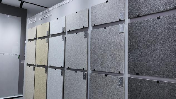 本次展會,金利源集團展出各類墻巖板系列,主要以灰色等素色系列為主,亞麻灰、薄霧灰、坦;业炔煌龋砻娌捎孟炠|(zhì)釉工藝,啞光渲染,觸手如嬰兒肌膚般潤滑,表面工藝也各有差別,分為Swan天鵝絨系列、Silky金絲絨系列等,750×1500㎜、600×1200㎜為主要展示的規(guī)格。