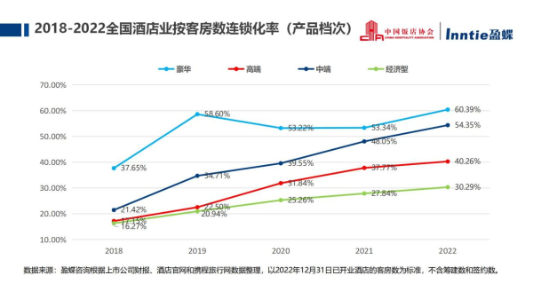 《2023中國酒店業(yè)發(fā)展報告》數(shù)據(jù)顯示,截止2022年12月31日,中國內(nèi)地(大陸)住宿業(yè)設施總數(shù)為43萬家,客房總規(guī)模1529.1萬間。其中酒店業(yè)設施27.9萬家,客房總數(shù)1426.4萬間——其中連鎖客房數(shù)是553萬間,連鎖化率約為39%,酒店非連鎖化率約占61%,酒店品牌化的空間仍較大。