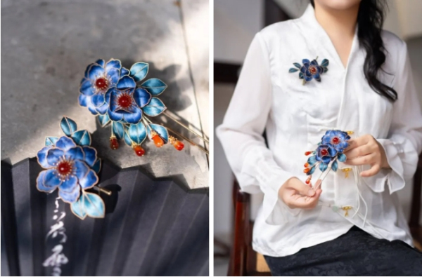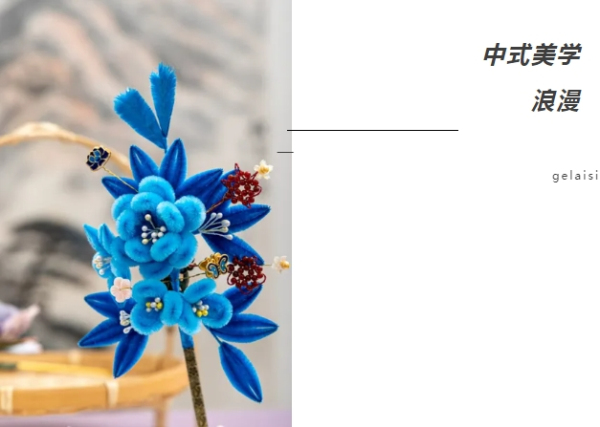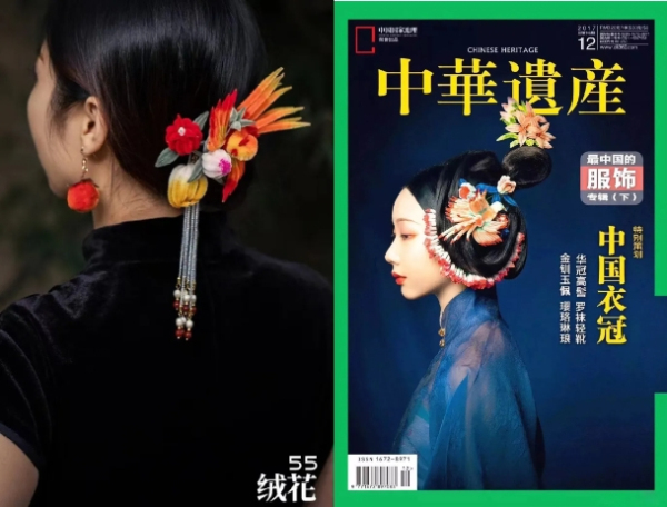 征珊珊結(jié)合自己的設(shè)計專業(yè)和母親的技藝,將傳統(tǒng)技藝與現(xiàn)代審美相融合,設(shè)計、制作出精美的鬢頭花、帽花、蝴蝶結(jié)等新型絨花產(chǎn)品。作為一種配飾,絨花與漢服最相配,一身純色漢服,并不需要多么華麗,插一枚絨花,就足以相得益彰。
