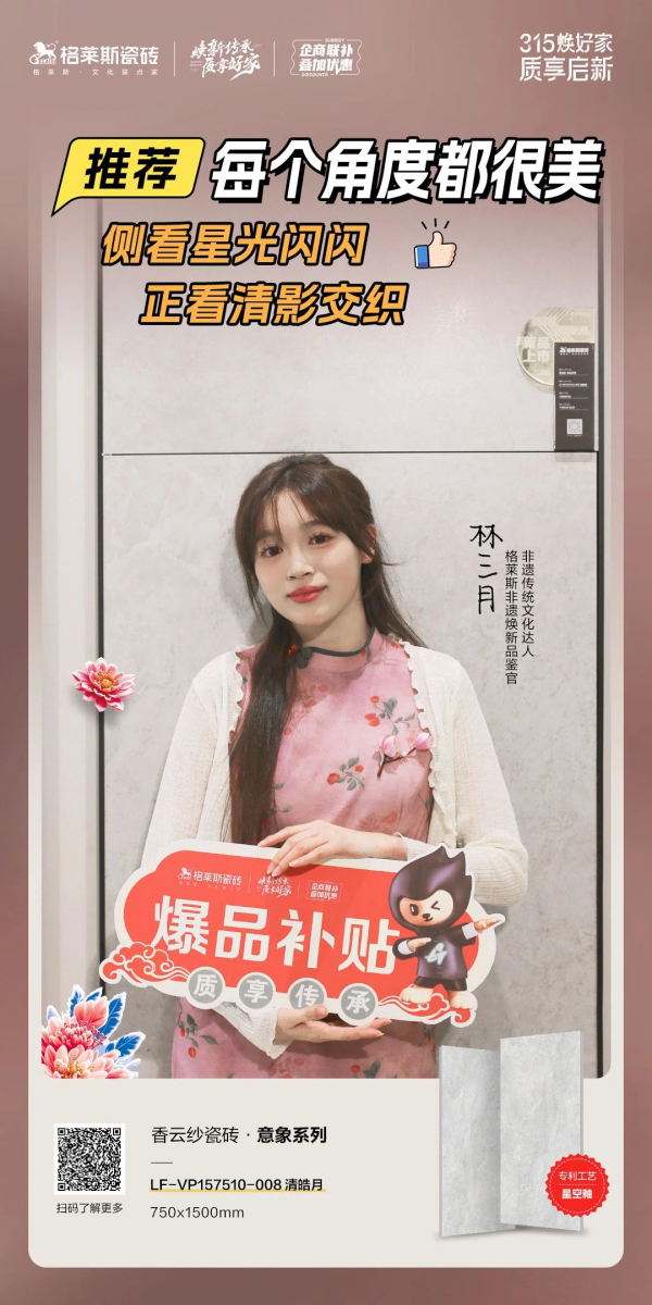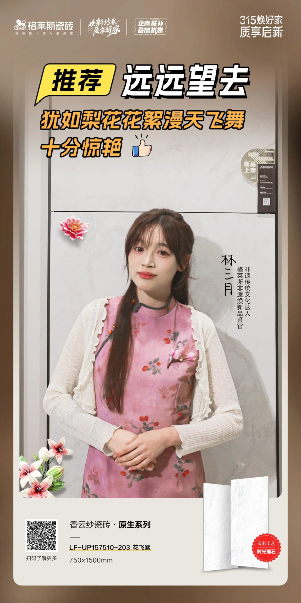 非遺文化作為頂級華流,在春晚的舞臺上華麗綻放,點燃了大眾對傳統(tǒng)文化的熱愛與自豪,就在今年315格萊斯發(fā)起“315煥好家 質(zhì)享啟新”全國聯(lián)動促銷,攜手非遺傳統(tǒng)文化達人林三月、絨花非遺傳承人征珊珊,以絨花為謀,以價值詮釋傳承煥新,推出非遺紀錄片《詩意東方 瓷韻絨光》。