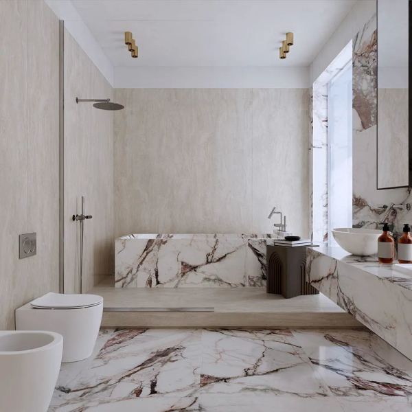 衛(wèi)浴空間是私密的療愈場域。地面與浴缸、洗手臺選用可可西里【茶卡金】產(chǎn)品,金絲絨復(fù)刻釉技術(shù)將原石的細(xì)膩脈絡(luò)完美呈現(xiàn),茶色基底中游走著鎏金絲線,赤腳踏上仿佛觸及被陽光烘暖的戈壁礫石。