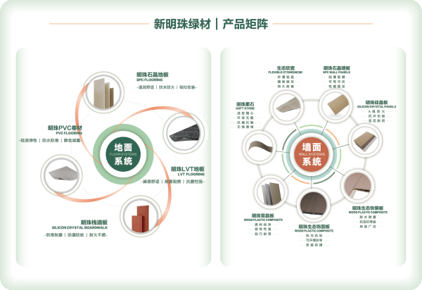 產(chǎn)品矩陣龐大。地面系統(tǒng)產(chǎn)品包含“石晶地板、LVT地板、PVC卷材、明珠棧道板”,墻面系統(tǒng)產(chǎn)品包含“生態(tài)軟瓷、明珠柔石、石晶墻板、硅晶板、雪晶板、生態(tài)飾面板、生態(tài)快裝板”,為家居空間、商業(yè)場所、醫(yī)養(yǎng)領(lǐng)域等提供一站式整體空間解決方案。