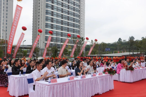 領導嘉賓代表們上臺進行剪彩揭幕。金剪齊開,彩帶飄揚,瑞獅獻瑞,在全場熱烈的掌聲中,宜賓冠珠正式揚帆起航!