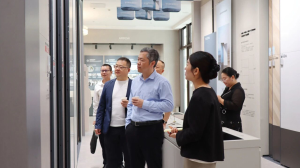 ▲住房和城鄉(xiāng)建設(shè)部科技與產(chǎn)業(yè)化發(fā)展中心處長梁洋、中國建筑材料流通協(xié)會(huì)執(zhí)委副會(huì)長李作奇一行蒞臨箭牌瓷磚總部大廈參觀交流