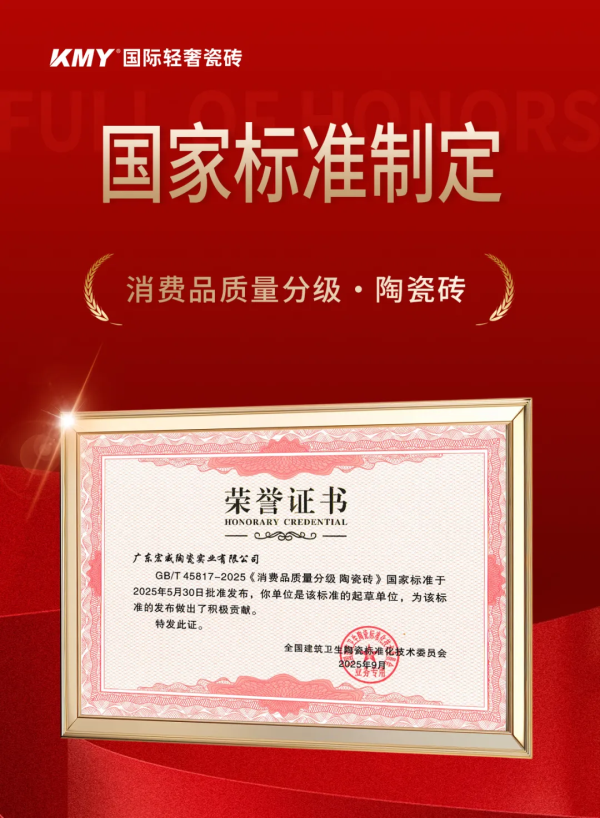 彰顯陶瓷大企實(shí)力,引領(lǐng)行業(yè)品質(zhì)升級!KMY卡米亞國際輕奢瓷磚于近日通過新國標(biāo)最高級別的5A檢測。此次官方權(quán)威認(rèn)證,標(biāo)志著KMY以超越國標(biāo)最高要求的硬實(shí)力,奠定行業(yè)品質(zhì)新基準(zhǔn)。