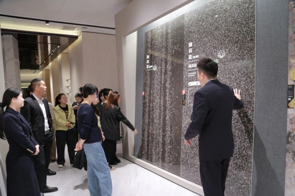 一行人駐足觀摩“海貝花”等特色瓷磚的紋理質(zhì)感,觸摸感受產(chǎn)品工藝細(xì)節(jié);