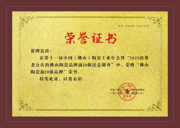 實力登榜|箭牌瓷磚斬獲 2025 佛山陶瓷前 20 強品牌榮譽
