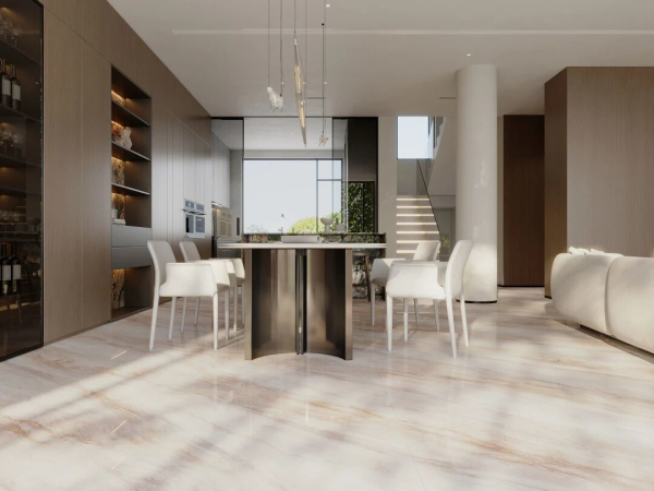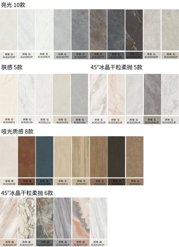 宋境·玉系列采用45°柔拋疊加冰晶干粒工藝,呈現(xiàn)溫潤玉石光感;宋境·石系列通過新一代高透釉和第四代肌膚釉技術(shù),還原天然石材的通透肌理;宋境·錦系列運(yùn)用3D立體精雕結(jié)合閃光干粒,雕琢錦緞暗紋;宋境·畫系列則采用高透釉與冰晶干粒,渲染水墨朦朧意境;宋境·木系列采用仿古精雕工藝,精準(zhǔn)復(fù)刻木材原生質(zhì)感。