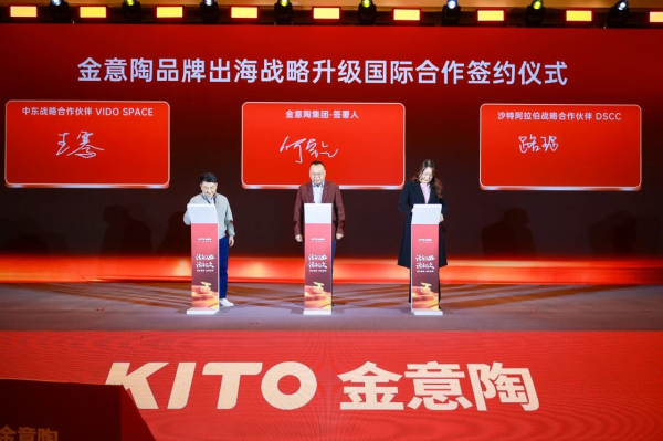 金意陶不僅向內(nèi)夯實(shí)根基,更向外擘畫了全球化發(fā)展新藍(lán)圖。會上,金意陶集團(tuán)董事長何乾與阿聯(lián)酋戰(zhàn)略合作伙伴 VIDO SPACE CEO王騫、沙特阿拉伯戰(zhàn)略合作伙伴 DSCC CEO路璐正式簽署戰(zhàn)略合作協(xié)議。在國內(nèi)國際雙循環(huán)的新發(fā)展格局下,金意陶正以領(lǐng)軍者之姿,參與全球產(chǎn)業(yè)鏈的競爭,進(jìn)一步提升國際競爭力,推動陶瓷行業(yè)的創(chuàng)新發(fā)展。