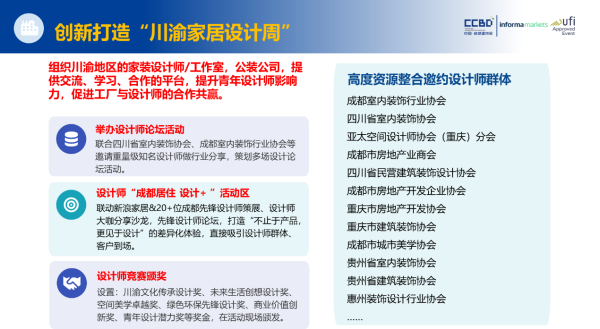 展會(huì)還將攜手新浪家居及20余位成都先鋒設(shè)計(jì)師聯(lián)合策展,通過(guò)設(shè)計(jì)師大咖分享沙龍、先鋒設(shè)計(jì)師論壇等活動(dòng),打造“不止于產(chǎn)品,更見(jiàn)于設(shè)計(jì)”的差異化體驗(yàn),精準(zhǔn)吸引設(shè)計(jì)師群體與優(yōu)質(zhì)客戶到場(chǎng)交流。設(shè)計(jì)周特設(shè)新材料、新工藝區(qū)、創(chuàng)意概念區(qū)、設(shè)計(jì)師作品區(qū)三大特色展區(qū),全方位展現(xiàn)行業(yè)前沿趨勢(shì)與設(shè)計(jì)落地成果,F(xiàn)場(chǎng)還將頒發(fā)“川渝文化傳承”“未來(lái)生活創(chuàng)想”“空間美學(xué)卓越”等六大獎(jiǎng)項(xiàng),表彰行業(yè)精英,激發(fā)創(chuàng)新活力。