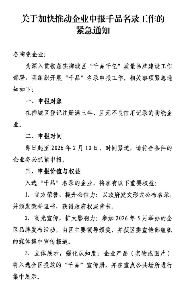 關(guān)于加快推動陶瓷企業(yè)申報千品名錄工作的緊急通知