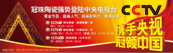 為加強(qiáng)新明珠陶瓷各品牌的宣傳推廣力度,打破傳統(tǒng)的推廣效應(yīng),新明珠陶瓷集團(tuán)旗下品牌冠珠、薩米特、格萊斯、惠萬家、路易摩登、賓利、金利高、金朝陽、蒙地卡羅、德美陶瓷于2012年12月17強(qiáng)勢登陸央視,新明珠陶瓷相關(guān)廣告片相繼在央視1套、2套及綜合頻道《新聞聯(lián)播》、《朝聞天下》、《交換空間》等知名欄目隆重開播,這也是新明珠陶瓷首次大規(guī)模在央視進(jìn)行宣傳推廣,廣告內(nèi)容將突出新明珠陶瓷各品牌效應(yīng)和產(chǎn)品裝修效果。