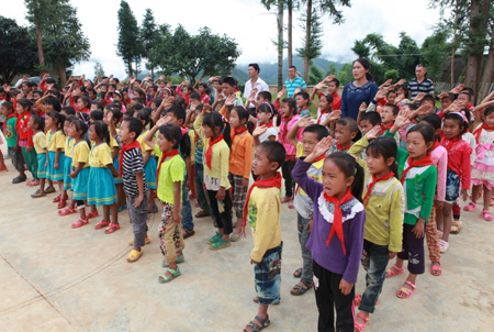 幫東完小學(xué)在一個山頂,當(dāng)?shù)厣顥l件雖差,但學(xué)校教學(xué)樓以及課桌都比較完整,看來當(dāng)?shù)貙τ诮逃是非常重視的。上午10點鐘,我們首先進行了升國旗儀式,兩位小旗手在全場小朋友清脆的國歌聲中將國旗冉冉升起。之后開始進行書包捐贈儀式,縣教育局領(lǐng)導(dǎo)以及L&D陶瓷品牌部總監(jiān)陸新華先生上臺發(fā)表了致辭。 陸總為大家介紹了L&D陶瓷熱心公益的事跡,并鼓勵孩子們好好學(xué)習(xí),奮發(fā)向上,爭取早日成為祖國的棟梁之才。