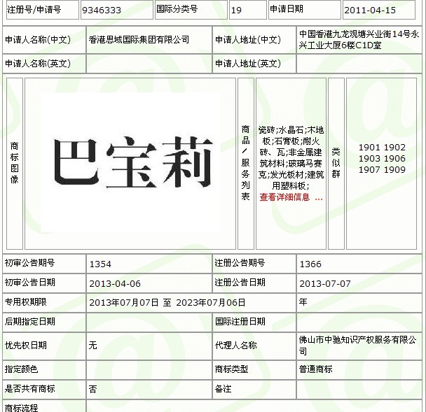 商標(biāo)涵蓋行業(yè):瓷磚、水晶石、木地板、石膏板、耐火磚/瓦、非金屬建筑材料、玻璃馬賽克、發(fā)光板材、建筑用塑料板。