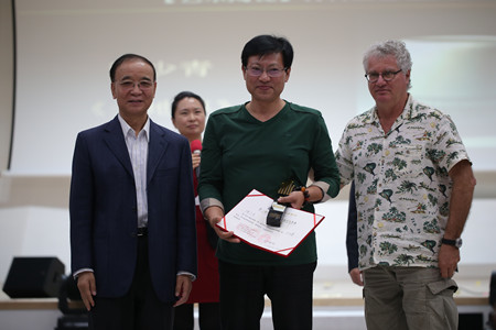 廣州大學藝術設計學院黨委書記詹武為JNJ馬賽克代表頒獎