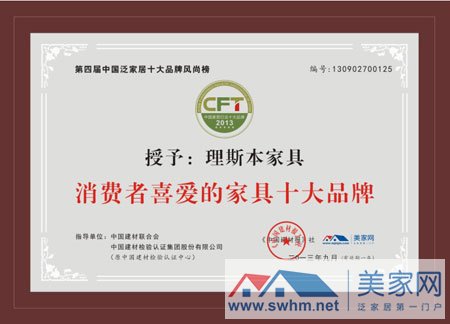 2013年9月28日,由中國建材聯(lián)合會(huì)指導(dǎo),中國建材檢驗(yàn)認(rèn)證中心、中國建材報(bào)社主辦,美家網(wǎng)、廣州長漢商務(wù)有限公司聯(lián)合承辦的中國綠色建材質(zhì)量年啟動(dòng)儀式暨第四屆中國泛家居十大品牌風(fēng)尚榜頒獎(jiǎng)大會(huì),在廣東佛山南國桃園楓丹白露酒店隆重開幕。廣東理斯本家居實(shí)業(yè)有限公司憑借著雄厚的品牌實(shí)力,優(yōu)質(zhì)的產(chǎn)品和一流完善的服務(wù)等綜合優(yōu)勢在眾多競爭者角逐中脫穎而出榮獲“消費(fèi)者喜愛的十大家具品牌”,這無形中彰顯了理斯本家具的品牌價(jià)值,也激勵(lì)著理斯本家具不斷創(chuàng)新,不斷為消費(fèi)者帶來更好更優(yōu)質(zhì)的特色產(chǎn)品和更加人性化更加完善的服務(wù)。