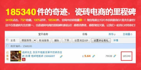 2012年6月,瓷磚先生木紋磚銷(xiāo)量累計(jì)超5萬(wàn)件,穩(wěn)居淘寶全網(wǎng)木紋磚銷(xiāo)量冠軍。