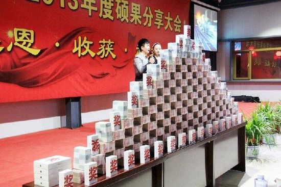 2014年01月21日,河南柘城,某地產(chǎn)全體員工召開“2013年度碩果分享大會”,F(xiàn)場發(fā)放工資、獎金總額共達(dá)1100萬元,有的員工最多發(fā)200萬元,直接用麻袋裝現(xiàn)金。抽獎獎品包括30部iPhone5s、5臺42寸液晶電視、2部手提電腦、3臺空調(diào)及Ipad mini、電動車、電冰箱、相機(jī)等大獎。堆積如山的1100萬現(xiàn)金。