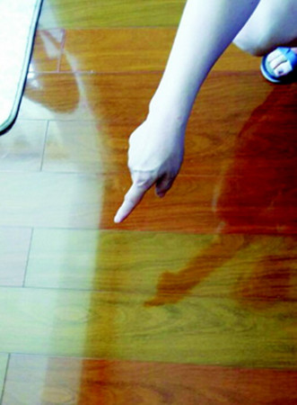 林先生指著地板說,深色地板是地板本來的顏色,淺色的是變色的地板,反差非常明顯!