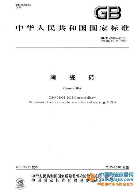 GB/T4100—2015《陶瓷磚》國家標(biāo)準(zhǔn)由國家質(zhì)量監(jiān)督檢驗(yàn)檢疫總局及國家標(biāo)準(zhǔn)化管理委員會(huì)于2015年5月15日聯(lián)合發(fā)布。該標(biāo)準(zhǔn)代替了GB/T4100—2006《陶瓷磚》國家標(biāo)準(zhǔn),對(duì)多項(xiàng)陶瓷磚產(chǎn)品國家標(biāo)準(zhǔn)進(jìn)行了重新修訂。宏陶陶瓷參加起草了GB/T4100—2015《陶瓷磚》國家標(biāo)準(zhǔn)。
