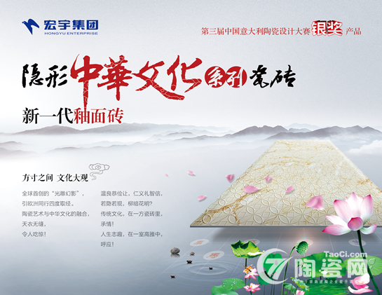 現階段陶瓷行業(yè)處于競爭激烈的非常時期,導致當今陶瓷行業(yè)競爭無序的一個重要原因是產品同質化現象嚴重,特別是瓷磚產品在創(chuàng)意設計這一方面沒有跟上國外的先進水平。毋庸置疑,率先掌握先進技術,融入文化因子,研發(fā)推出新產品的企業(yè)必定能夠引領發(fā)展新潮流。我個人認為宏宇新推出的這款“隱形中華文化系列瓷磚”必定能夠受到終端銷售市場的追捧,但需要時間來驗證,我們拭目以待。