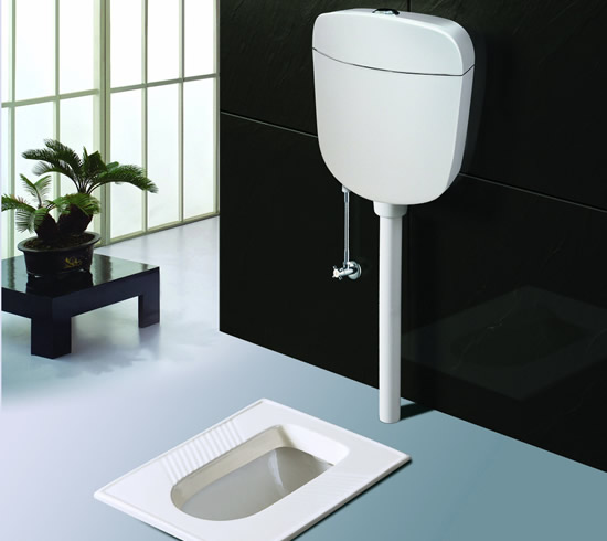 4、與蹲便器相配合安裝的水箱,水箱安裝高度距離便器水圈1.8米,水壓要求0.14~0.55Mpa為宜,才能有效達(dá)到良好的沖水效果。