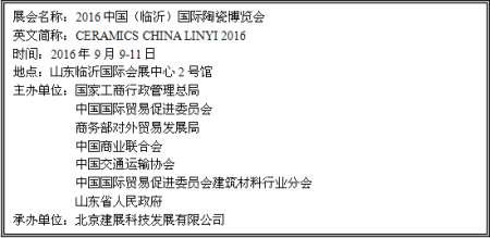 2016中國(臨沂)國際陶瓷博覽會將于9月9日至11日在臨沂舉辦,本屆商博會以“商貿(mào)通五洲,大美新臨沂”為主題,按照“政府引導(dǎo)、市場運(yùn)作、社會參與、節(jié)儉辦會”的原則,著力推動(dòng)商博會專業(yè)化、國際化、品牌化、信息化建設(shè)。本屆展會設(shè)在2號館,設(shè)標(biāo)準(zhǔn)展位1000個(gè)。