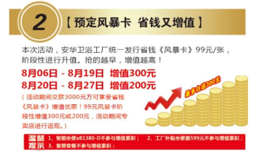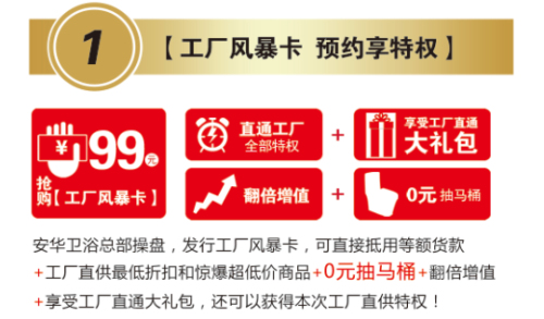 一、工廠風(fēng)暴卡,預(yù)約享特權(quán):8月27日,憑卡到活動(dòng)現(xiàn)場(chǎng)簽到,免費(fèi)領(lǐng)取安華衛(wèi)浴精美禮品一份。