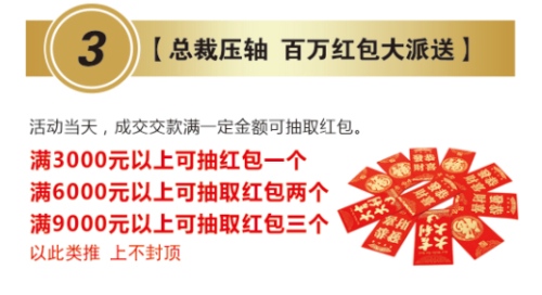 三、總裁壓軸,百萬(wàn)紅包大派送:活動(dòng)當(dāng)天,凡購(gòu)買(mǎi)滿(mǎn)一定的金額,最高1000元紅包等您來(lái)抽。