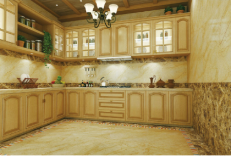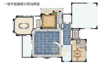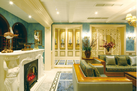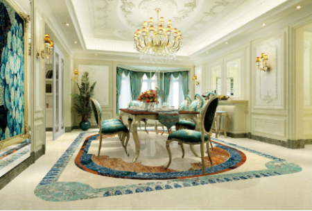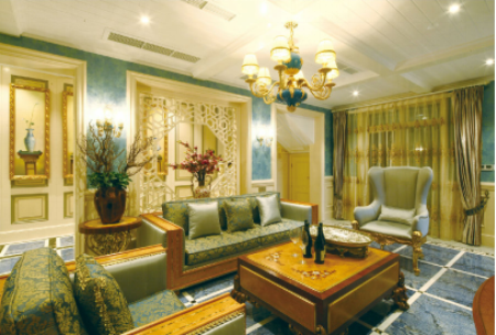 采用簡一大理石瓷磚景泰藍、伊麗莎白鋪于地板,使黃、藍兩個主調的沖撞不顯突兀,客廳極盡華美卻不冗重。