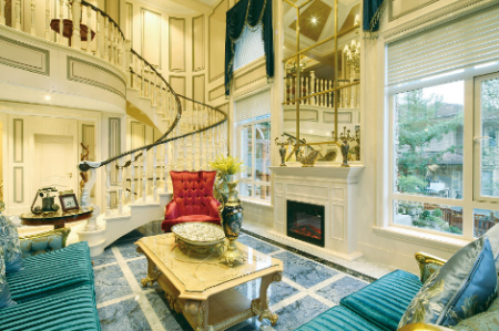 精致的大廳是女主人品味的直接體現(xiàn):富絡紋理的沙發(fā)讓董小姐能夠隨時接待事業(yè)上的伙伴、燒得火紅的壁爐總在嚴嚴冬日里帶來幾絲暖意、復古的撥號電話在滿足日常使用的同時,更體現(xiàn)出董小姐對生活情調的要求。