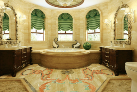 參觀完了廚房,我們來到了衛(wèi)浴間。鑒于新法式風格講究 “對稱”的建構手法,以此構造高度的美感,John便以軸線為基準,用立地柜、弧形鏡等來呈現(xiàn)整個空間對稱的兩邊,顯現(xiàn)衛(wèi)浴間的宏大布局。