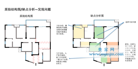 設計難點:原始結構戶型不合理。其一,采光通風達不到要求;其二,現(xiàn)有的生活空間功能性不能滿足業(yè)主的生活需求,如餐廳、客廳并不能滿足家庭聚會的;其三,業(yè)主在臥室生活空間對儲物功能的不滿足。