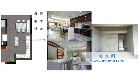 通過多次溝通,解決了通風采光的問題,把狹小的空間變成很大的開放空間,過道還多了一個早餐抬,而且還呈現(xiàn)了一個雙開門冰箱和裝飾酒柜。
