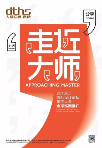 由國際設(shè)計論壇(IDF)2016年度大會戰(zhàn)略合作伙伴--大唐合盛瓷磚,攜手國際設(shè)計論壇(IDF)組委會、廣州設(shè)計周推出“走近大師”2016IDF國際設(shè)計論壇年度大會全球巡回推廣活動,為全國設(shè)計師搭建與國內(nèi)外著名大師的溝通互動平臺,打造中國建筑裝飾行業(yè)的設(shè)計智慧盛宴。2016年“走近大師”系列活動包括“走近大師”全球巡回推廣面向全國重點城市高端設(shè)計師群體,加強與設(shè)計精英的互動交流;“走進(jìn)大師工作室”近距離與設(shè)計大師溝通交流,與大師平等對話,感悟港臺設(shè)計風(fēng)情,啟迪創(chuàng)作源泉。國際設(shè)計論壇(IDF)2016年度大會匯聚全球設(shè)計界專業(yè)人士,分享和探討“東方價值觀與當(dāng)代設(shè)計”。