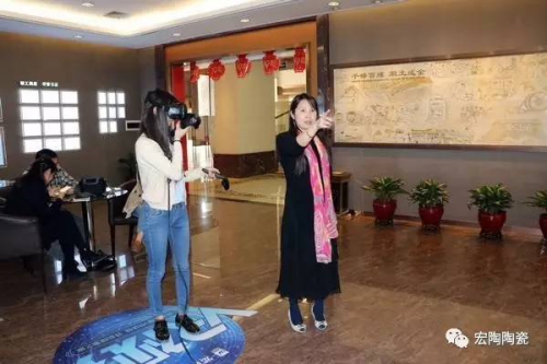 宏陶陶瓷接待組陪同參觀。宏陶市場部經(jīng)理符小燕現(xiàn)場講解恢宏大氣、文化底蘊深厚的宏陶展館產(chǎn)品展示情況及品牌發(fā)展歷程,重點介紹、演示了宏陶最新應用的VR高科技系統(tǒng),并手把手地教導考察團每位成員體驗VR的虛擬與現(xiàn)實對接之神奇世界。