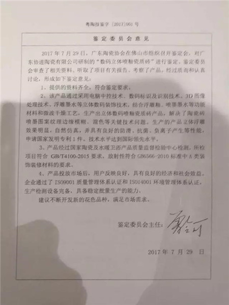 2017年7月29日上午10時(shí),廣東恊進(jìn)陶瓷有限公司珈納品牌摩卡館內(nèi),對公司研制的“數(shù)碼立體噴釉瓷質(zhì)磚”產(chǎn)品進(jìn)行鑒定。本次鑒定會(huì)特邀廣東陶瓷協(xié)會(huì)多名專家到場,對高仿真3D數(shù)碼噴釉功能立體圖案效果陶瓷磚及其制備方法進(jìn)行公開展示,并進(jìn)行學(xué)術(shù)報(bào)告。