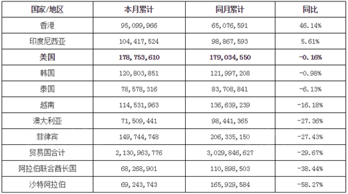 據(jù)海關(guān)數(shù)據(jù)顯示,2017年1-6月我國陶瓷磚出口額排在第一位的貿(mào)易國是美國,出口美國1.79億美元(同比下降0.16%),占我國陶瓷磚出口總額的8.39%。