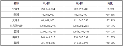 2017年1-6月我國陶瓷磚累計(jì)出口額各大洲同比情況