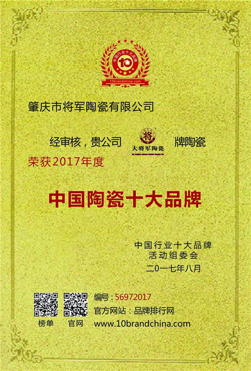大將軍陶瓷榮獲“中國陶瓷十大品牌”榮譽(yù)