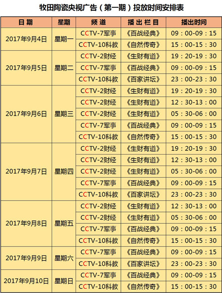 (圖為牧田陶瓷央視廣告(第一期)投放時間安排表)