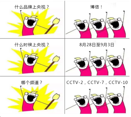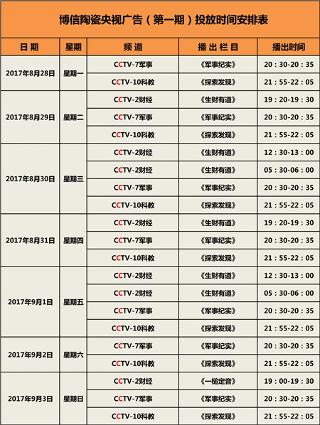 廣東省著名商標--博信陶瓷堅走品牌升級路,斥巨資在央視投放廣告,自2017年8月28日起,正式強勢登陸CCTV-2、CCTV-7、CCTV-10三大頻道,實現(xiàn)高頻次,全天不同時段展播!眾多經銷商朋友們在中央電視臺親眼目睹博信陶瓷的廣告宣傳視頻后,均表示“仿佛吃了一顆定心丸!自己以最真切的方式體驗到,博信陶瓷走上品牌升級路是真實的,是成功的!也更有信心跟著博信陶瓷擼起袖子加油干!”