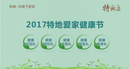 2017年9月,主題為“讓家更健康”的特地愛家健康節(jié)正式啟動,引發(fā)各界關(guān)注。據(jù)悉,這是一場由健康瓷磚倡導(dǎo)者-特地•負(fù)離子瓷磚發(fā)起的文化盛宴,旨在傳達(dá)“健康裝修”的消費理念,向消費者倡導(dǎo)健康、綠色、環(huán)保的家居生活方式。