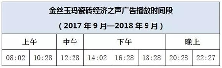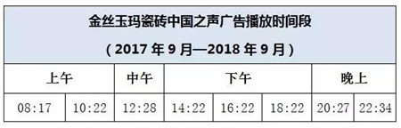 自2017年9月起,金絲玉瑪瓷磚在中央人民廣播電臺(tái)中國之聲、經(jīng)濟(jì)之聲投放長達(dá)一年的品牌廣告正式上線。