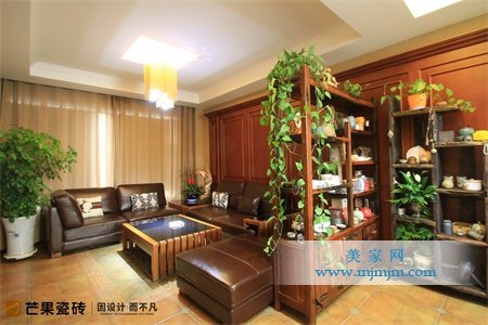 無(wú)須雕琢張揚(yáng),幾何直線(xiàn)的造型讓整個(gè)會(huì)客空間更顯穩(wěn)重大方。暖橙地磚搭配深色系沙發(fā),圍合出穩(wěn)靜而又坦誠(chéng)的晤談氣氛。生機(jī)盎然的綠植布置,與古樸雅拙的船木書(shū)柜相映成趣,散發(fā)出靈動(dòng)而又清澈的氣韻。