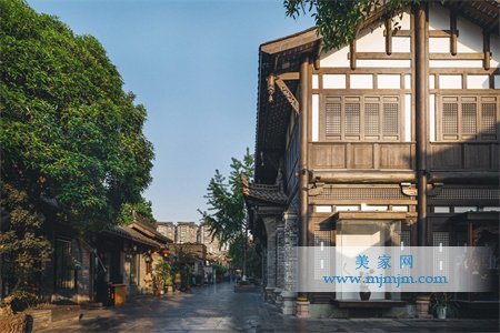 “少城記憶”追溯的是記憶,所以它秉承傳統(tǒng)。色彩十分樸素,多以冷色調為主,瓦為青色、梁柱為茶褐色、門窗多為木色。整體“雕而不畫”。