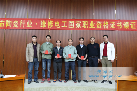 2018年3月21日下午,由佛山市陶瓷行業(yè)協(xié)會(huì)、佛山市禪城區(qū)愷睿職業(yè)培訓(xùn)學(xué)校共同舉辦的首次維修電工國(guó)家職業(yè)資格證書(shū)頒證儀式在中國(guó)陶瓷城五樓會(huì)議室舉行。蒙娜麗莎集團(tuán)員工林永發(fā)、龔森賢、黃裘忠、覃日新等13位學(xué)員獲得維修電工高級(jí)證書(shū)。