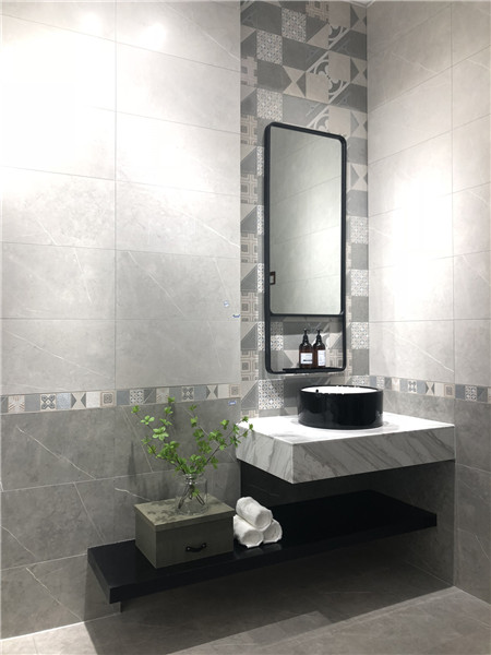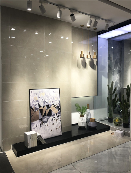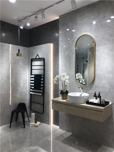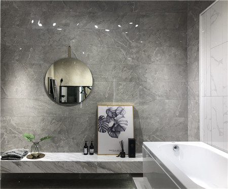 墻面可作電視背景墻、客廳地磚、沙發(fā)背景墻、廚衛(wèi)用磚。高級灰亮面磚深受年輕人喜愛,也很好搭配突出空間效果。