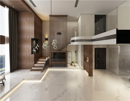 新中式的別墅客廳,磚面飄逸的閃電紋,在大面積鋪貼時呈現(xiàn)出更立體、更震撼的視覺效果。和天然石材如出一轍,實現(xiàn)原生態(tài)的無邊界視覺效果,營造大氣、優(yōu)雅的空間。